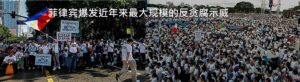 2025年9月起,菲律宾在短短七周内遭遇的四场大型台风,期间还发生了两次地震,人民在饱受气候威胁的〝天灾〞当下,方知「防洪工程贪腐」造成的〝人祸〞悲剧。近期台风重创菲律宾,造成259人丧命的严重灾情,引发民众对防洪工程贪腐丑闻的强烈不满。因此,菲律宾爆发近年来最大规模的反贪腐示威。警方表示,大约有65万名民众2025年11月6日在首都马尼拉集结展开3天的大型集会,要求政府彻查防洪工程贪腐丑闻,并对涉案官员和国会议员追究责任。